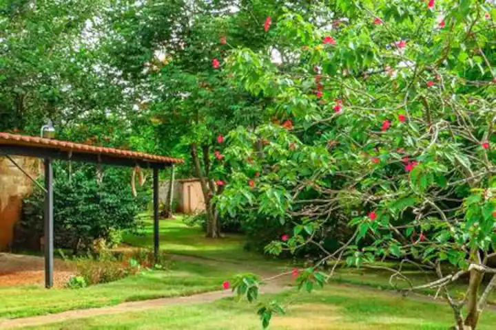 Esta exuberante propiedad de estilo de jardín está floreciendo y rebosante de vida, tiene hermosas plantas y flores, árboles frutales y un cielo azul increíblemente claro. El muro que rodea el jardín hace que el espacio sea completamente privado para cualquier persona que no se aloje en la propiedad.